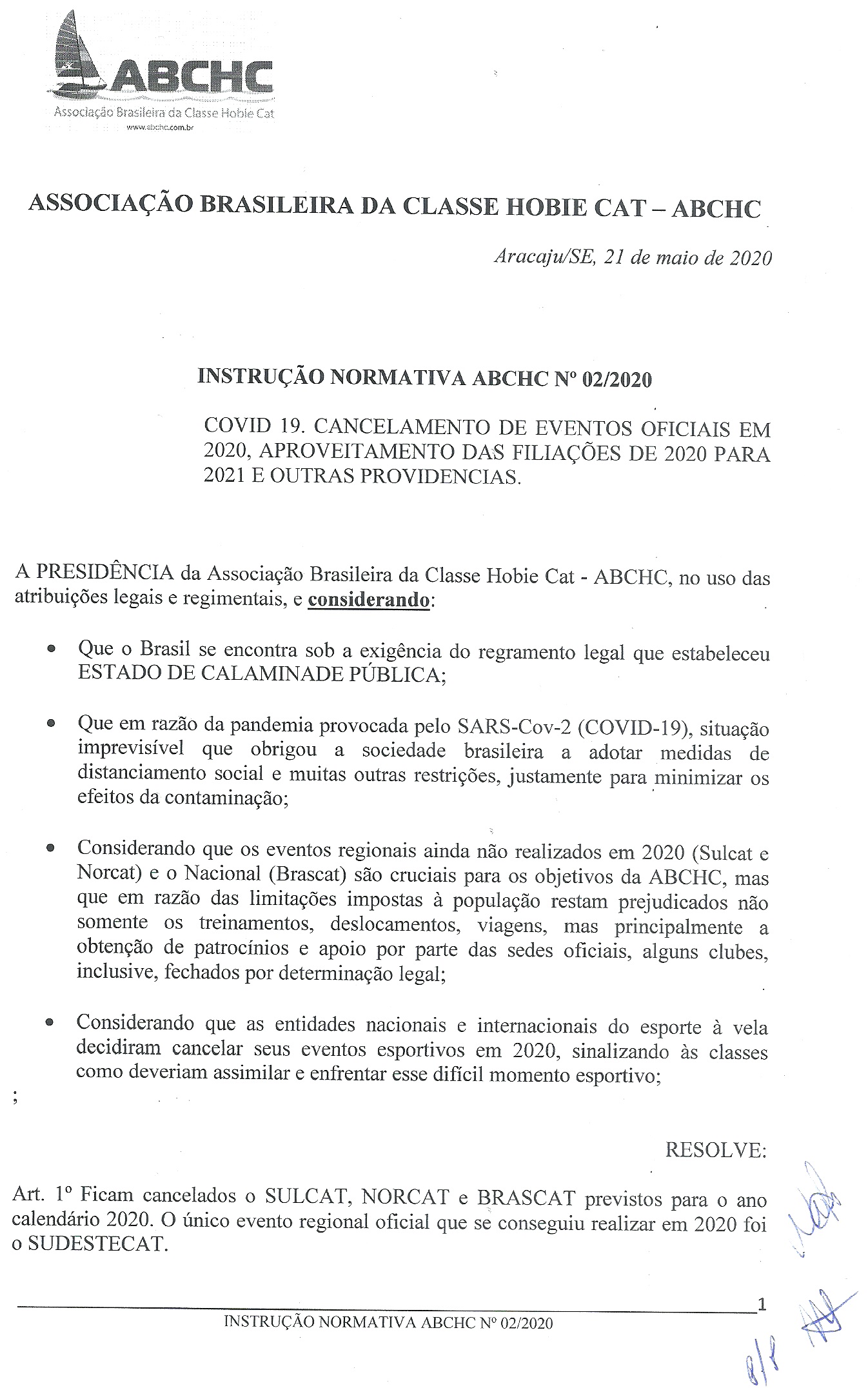 Diante do momento delicado em que o Brasil se encontra, com exigência do regramento legal estabelecido pelo ESTADO DE CALAMIDADE PÚBLICA e, após conversas com os organizadores do BRASCAT, a Presidência da Classe, no uso das suas atribuições legais e estatutárias, decide pelo CANCELAMENTO DOS EVENTOS OFICIAIS DA ABCHC 2020, a saber: BRASCAT, NORCAT E SULCAT. Mais informações, acesse http://www.abchc.com.br/