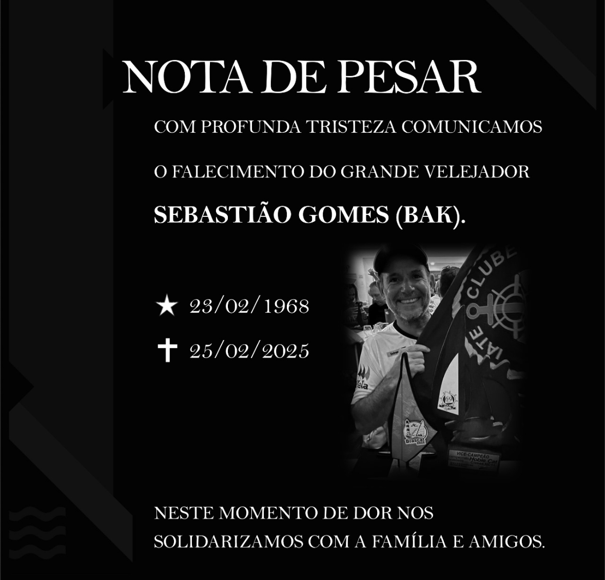 Neste momento de dor, nos solidarizamos com a família, amigos e toda a comunidade da vela, desejando força para superar essa irreparável perda.