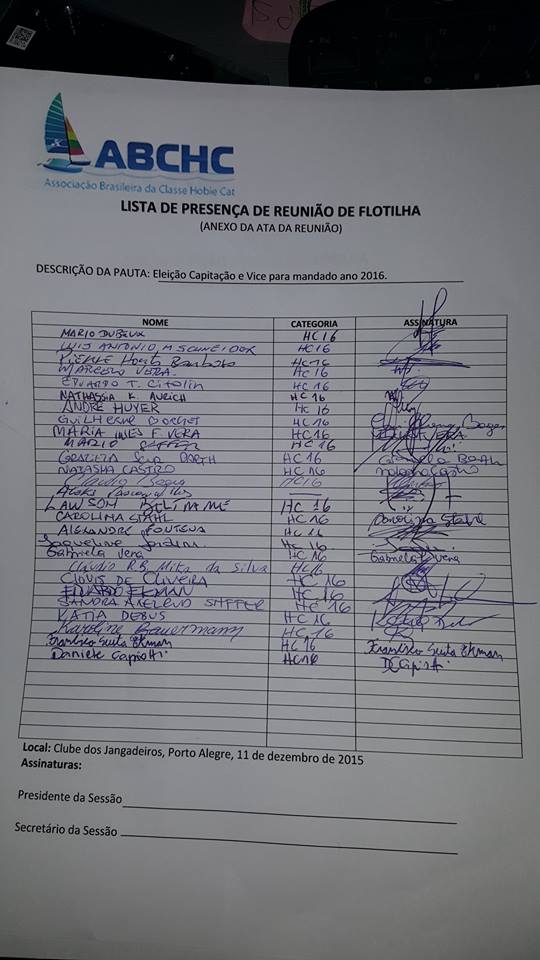 Na mesma oportunidade e atendendo a determinação do novo estatuto da ABCHC foi realizada a eleição para Capitão e Vice da Flotilha, objetivando o mandato de 2016. Haviam três chapas inscritas e por apenas dois votos de diferença Pierre Horta Barbosa e Marcelo Vera foram eleitos Capitão e Vice, respectivamente, para o período de 01/01/2016 até 31/12/2016.
