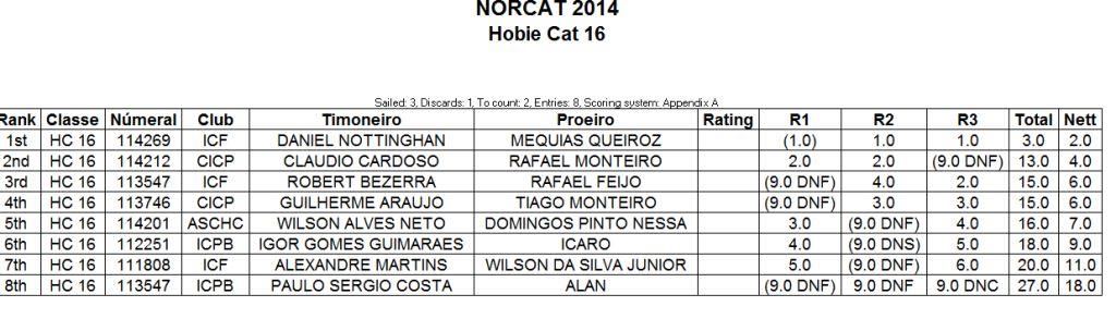 O Norcat começou ontem. No Hobie Cat 16 são 8 (oito) participantes dos Estados de PE, CE, PB e SE. Ontem, 06 de setembro de 2014, aconteceram 3 (três) regatas e os ventos sopraram bem fortes, segundo o Diretor Técnico da ABCHC, Wilson Alves Neto (SE): " quem virou pouco, visitou a casa dos "Tubarões" uma vez só ".