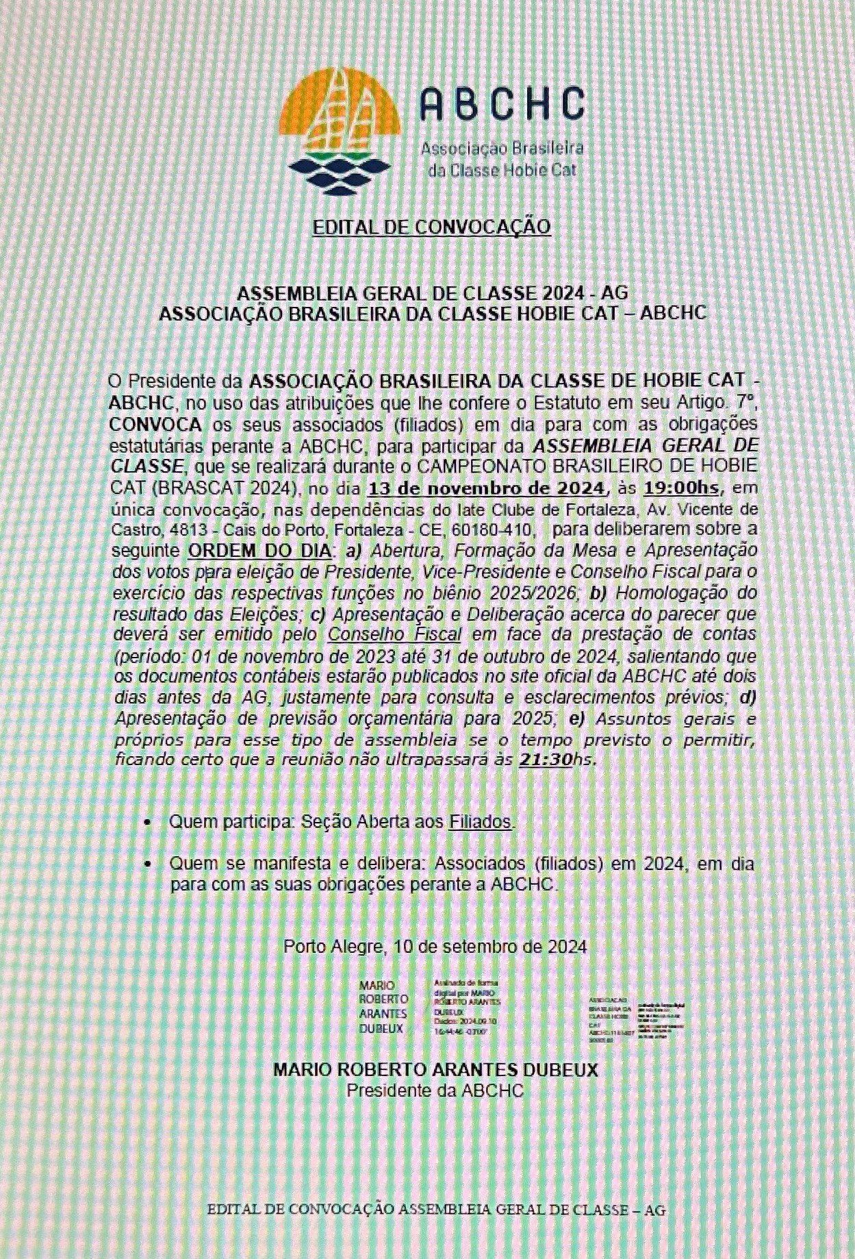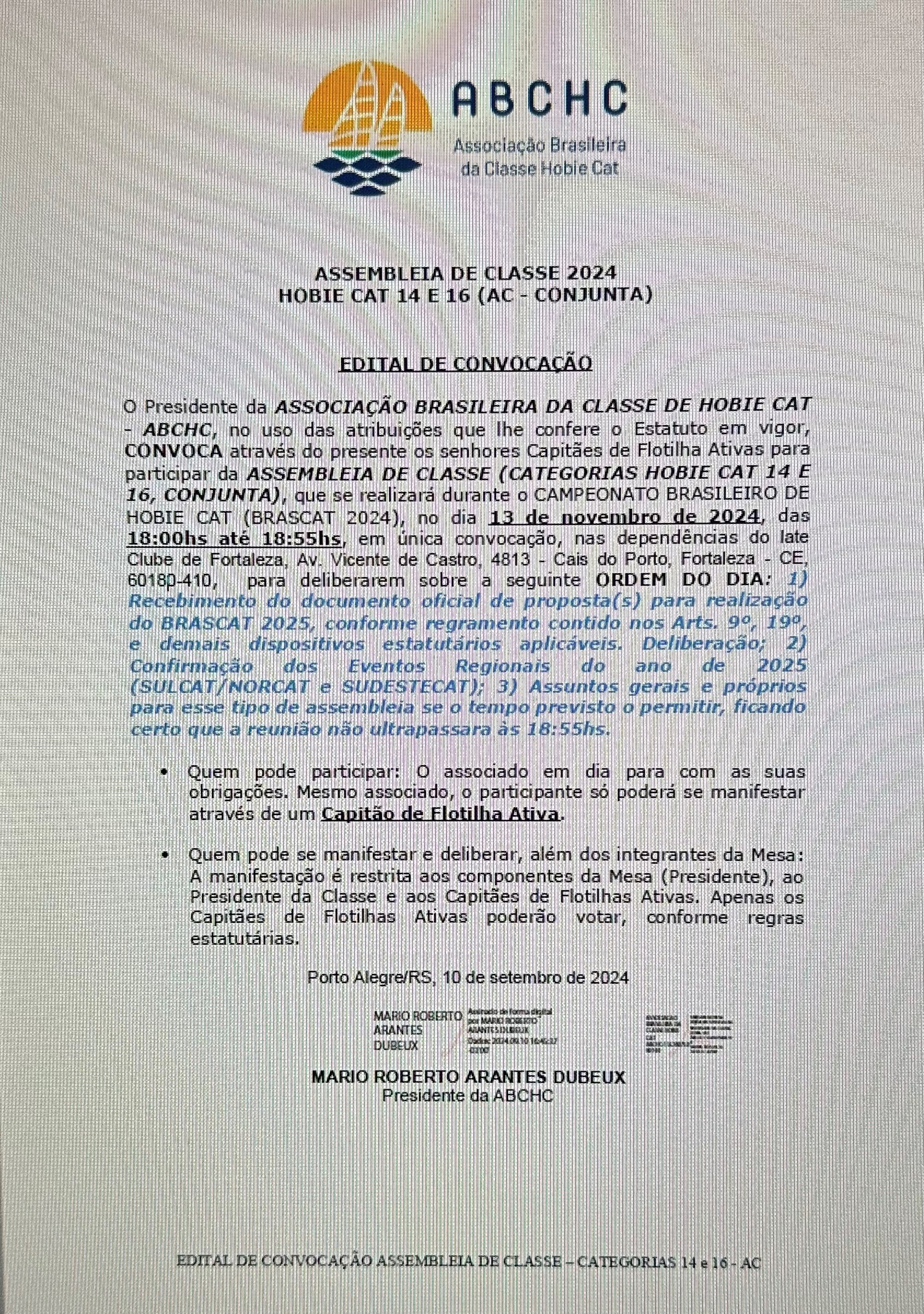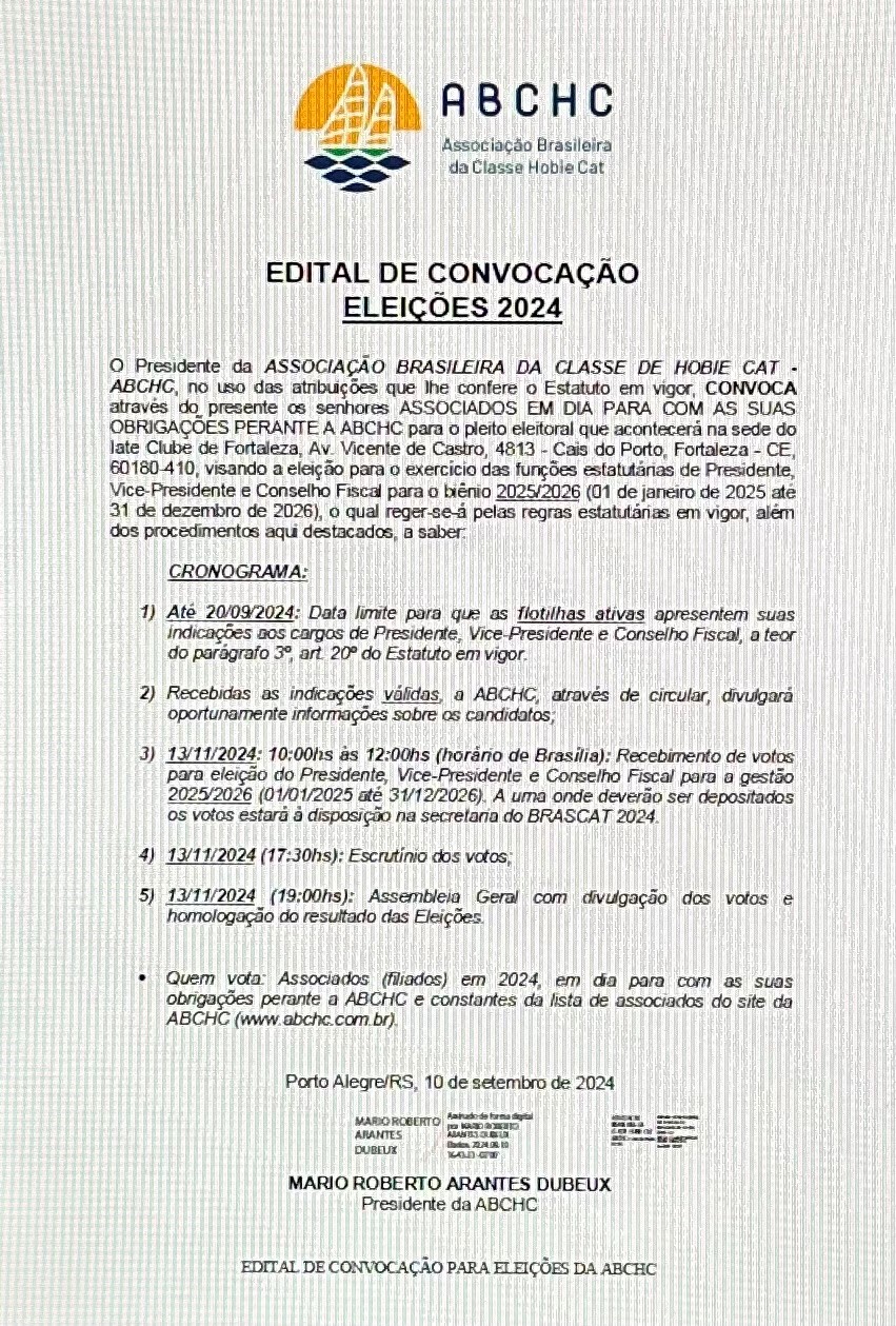 Parece que foi ontem, mas já estamos quase terminando esse nosso novo ciclo à frente da ABCHC. Desde já agradeço imensamente a confiança depositada, o que o faço em meu nome e em nome de toda a nossa Diretoria e Assessoria. E como determina nossa regra elementar (Estatuto da ABCHC) foram publicados, nesta data, três editais. O primeiro, que trata justamente do pleito eleitoral; O segundo convocando os capitães de flotilhas ativas para a assembleia de categoria, evento que dentre outros pontos escolhera a sede do BRASCAT 2025; E o terceiro e último convocando o Quadro Associativo para a Assembleia Geral.