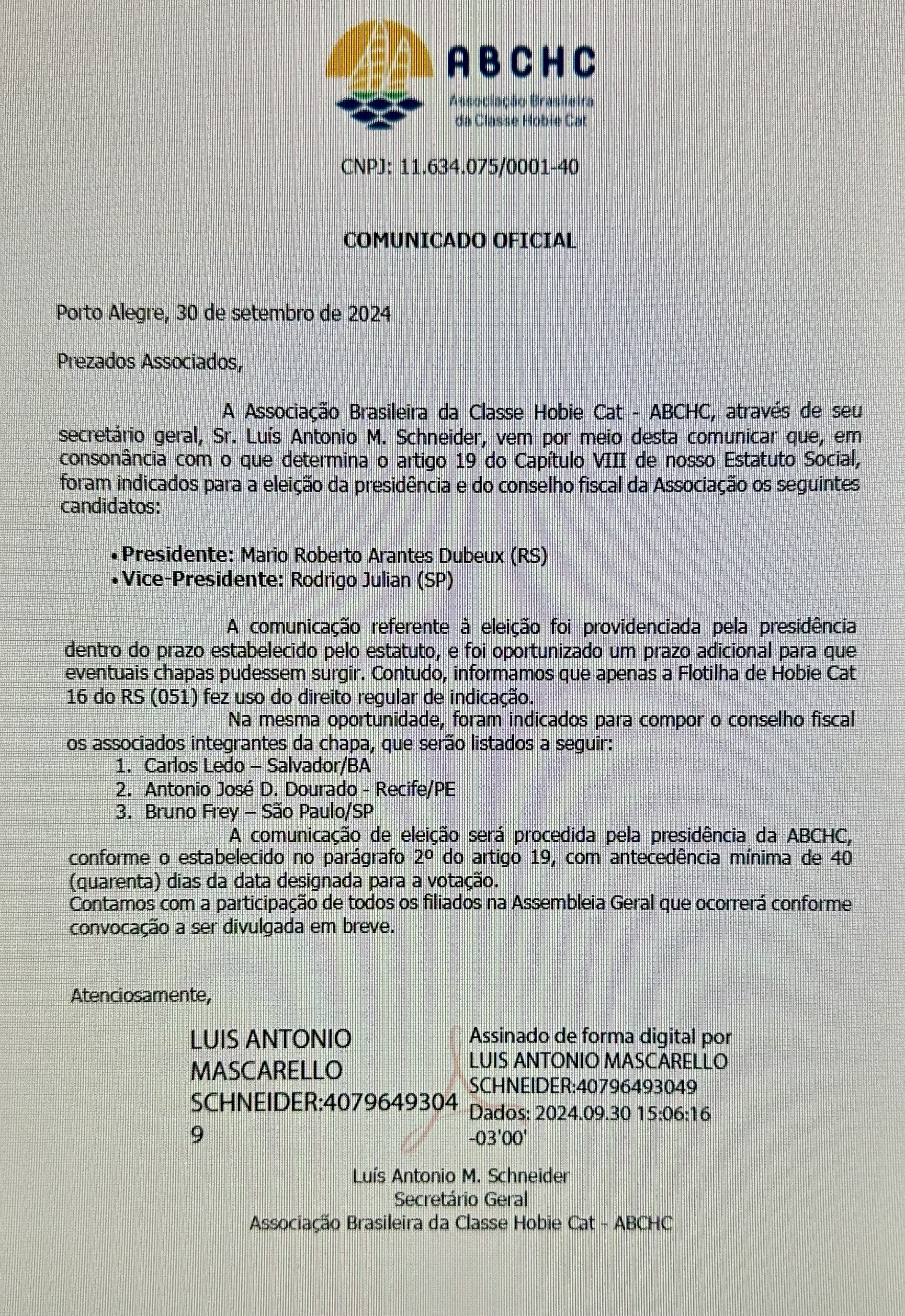 Em cumprimento ao regramento estabelecido pelo Estatuto vigente, a Presidência da Associação Brasileira da Classe Hobie Cat vem à publico informar que atendendo à convocação que deu conhecimento público do pleito eleitoral que se avizinha e que tem por objetivo o preenchimento dos cargos de Presidente, Vice-presidente e Conselho Fiscal da Associação Brasileira da Classe Hobie Cat – ABCHC, apenas uma CHAPA restou indicada pela Flotilha 051 – Porto Alegre/HC 16, a saber: