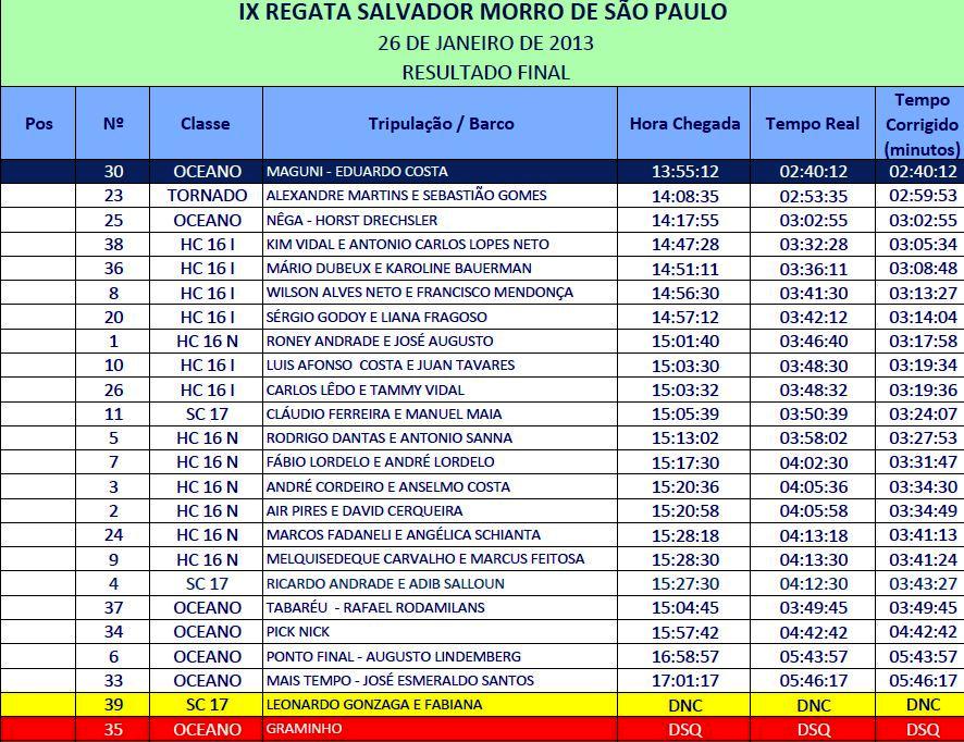 PODIUM: ·Hobie Cat 16 GERAL: 1° Lugar: Kim Vidal e Antonio Carlos Lopes neto (BA) 2° Lugar: Mario Dubeux e Karoline Bauermann (CDJ/RS) 3° Lugar: Wilson Alves Neto e Francisco Mendonça (SE) ·Hobie Cat 16 BARCO NACIONAL: 1° Lugar: Mario Dubeux e Karoline Bauermann (CDJ) RS ·Tempo Corrigido: 1° Lugar: Alexandre Martins/Sebastião Gomes (Tornado) CE 2° Lugar Kim Vidal e Antonio Carlos Lopes neto (BA) (Hobie Cat 16) BA 3° Lugar Mario Dubeux e Karoline Bauermann(Hobie Cat 16) RS