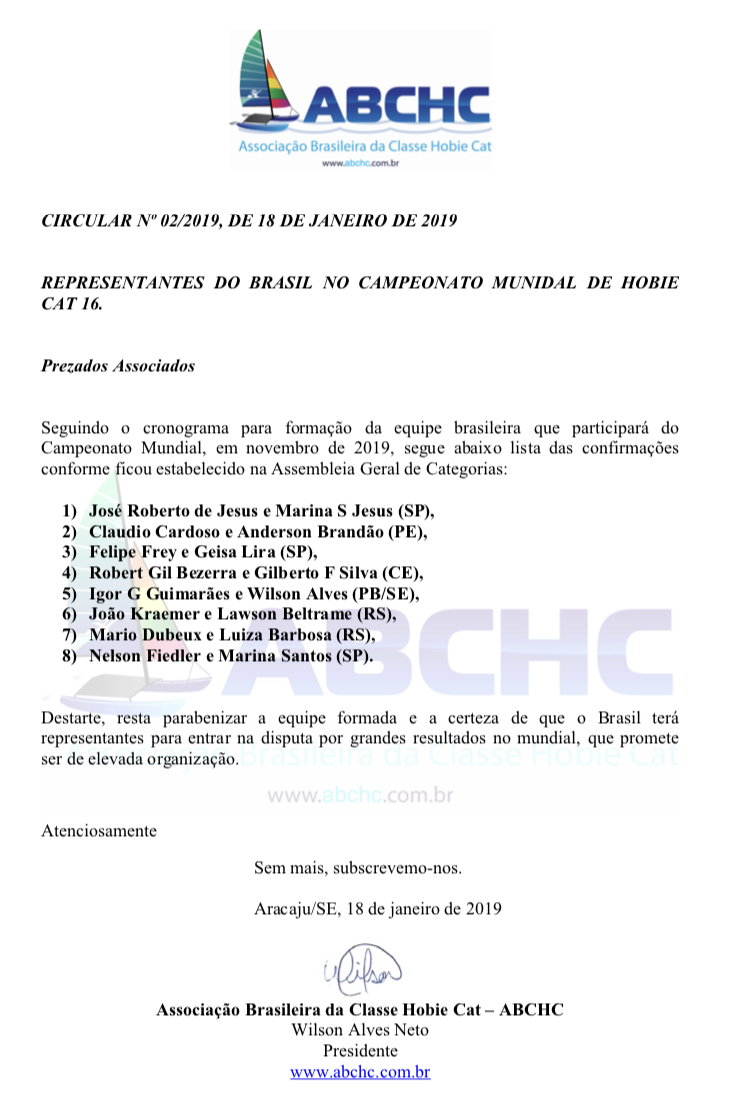 O Time do Brasil que irá defender o Pavilhão Nacional no próximo mundial de Hobie Cat 16, em novembro, na Florida/USA, já está definido.