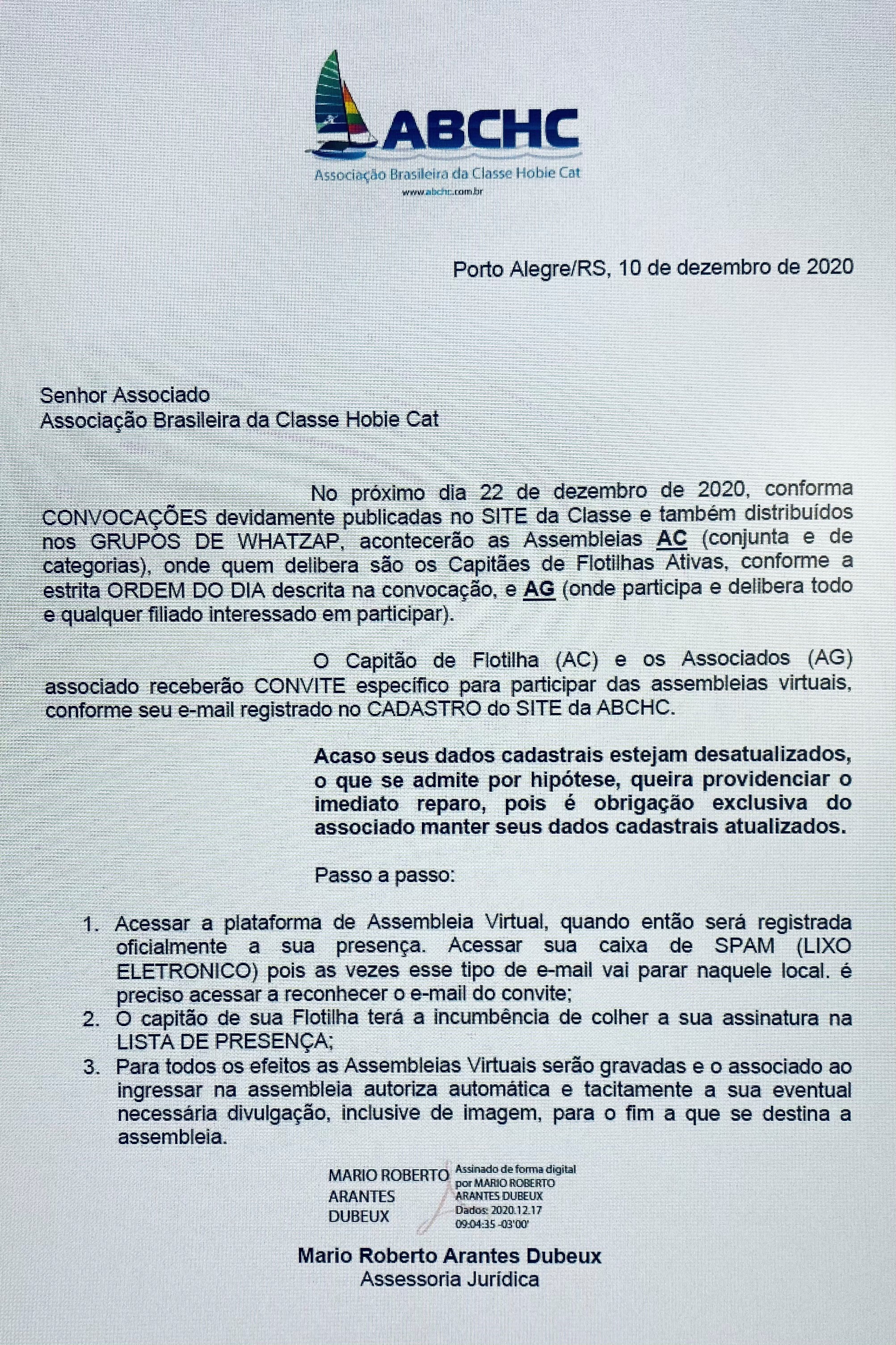 O Capitão de Flotilha (AC) e os Associados (AG) associado receberão CONVITE específico para participar das assembleias virtuais, conforme seu e-mail registrado no CADASTRO do SITE da ABCHC.
