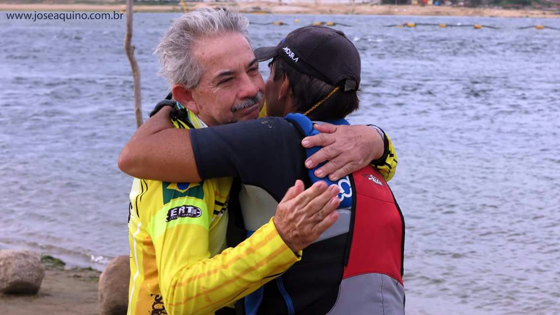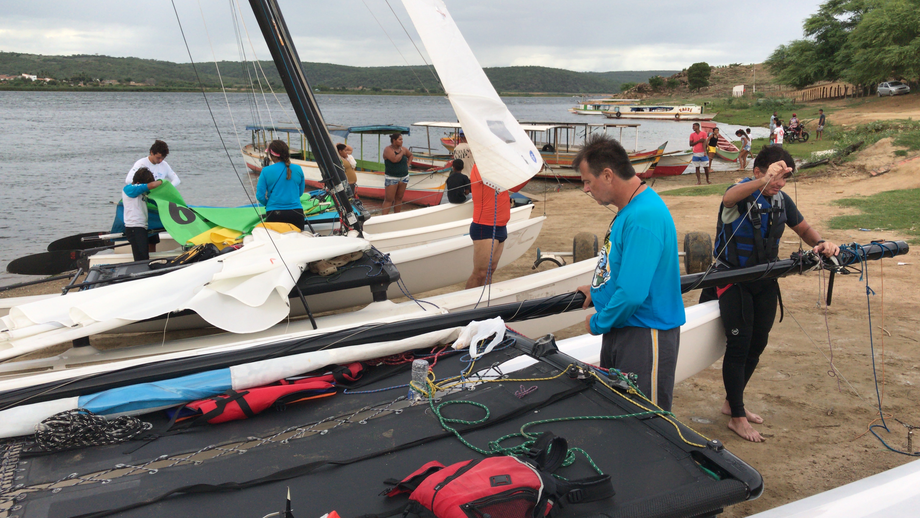 Acordamos por volta das 5:30 e as 6:00 já estávamos nos confraternizando no café da manhã, junto com a turma de bike (os Zuandeiros). Nossa largada foi aquela fuleragem e Guilherme e Nicole pularam na frente. Somente algum tempo depois conseguimos ultrapassar a dupla ponteira e ficamos brigando (sim porque regateiros não passeiam sem disputar) até boa parte do percurso, quando a dupla de Pernambuco tomou um rumo incorreto e foi ultrapassada por Tito e Ricardo, também de Pernambuco, que hoje andaram que nem malucos principalmente quando o vento caia. Vieram lá de trás e nos passaram, e Ricardo corneteando (pense num pentelho chato dos infernos). Um sol do cacete, sem vento, calor, e um peste buzinando no teu ouvido...vou te passar, vou de passar, câmbio, câmbio, câmbio, numa linguagem de doido que só ele entende ....%$%$#$%@$$E¨¨&&** Vale registrar que tudo que a falta de vento nos castigou ao longo desse longo derradeiro trajeto, fomos presenteados com um vento forte e perfeito nas imediações do ponto de chegada. Um barla e sota para ninguém botar defeito. Pense! Quando o vento chegou conseguimos voltar a liderar é assim o foi até o final. Claro que cada um quer andar rápido e chegar na frente, afinal de contas somos competidores por essência, como já falei, mas o moral da coisa é que cada qual tem seus limites e objetivos e o importante é que todos brincamos, e muito, nesses três dias de Rallye e cinco de integração. Foi bem legal. Obrigado a todos que contribuíram para esse sucesso. Agora vou tentar comer porque a última vez que coloquei algo no estômago foi às 6hs da manhã e já são 20 hs. Muito cansado. Assim que passei o meu último dia da vida com 53 anos de idade. Mas foi legal, apesar do esgotamento físico. Partimos de Gararu às 9:25 e chegamos (novamente em primeiro) por volta das 15:30hs. O vento esteve muito fraquinho durante boa parte do percurso, exceção das imediações de Porto da Folha e quando já estávamos chegando em Pão de Açúcar/AL ou Niterói/SE, como prefiram de um ou de outro lado do Velho Chico. Como sabíamos que íamos parar na frente de uma localidade chamada Pão de Açúcar, que ficava na margem alagoana, e nos aproximando vislumbramos uma enorme estátua Jesus Cristo sobre um morro, logo deduzimos que Niterói/SE estaria na margem oposta. Mas nem todos deduziram o mesmo. O resultado foi que três duplas ficaram literalmente encalhadas no lodo do outro lado de um morro de terra que estava sendo dragado. Mas nada que uns bordinhos a mais e umas sacaneadas na chegada não tenham resolvido. Todos no ponto final, são e salvos. Missão comprida e cumprida. Vale registrar que tudo que a falta de vento nos castigou ao longo desse longo derradeiro trajeto, fomos presenteados com um vento forte e perfeito nas imediações do ponto de chegada. Um barla e sota para ninguém botar defeito. Pense!