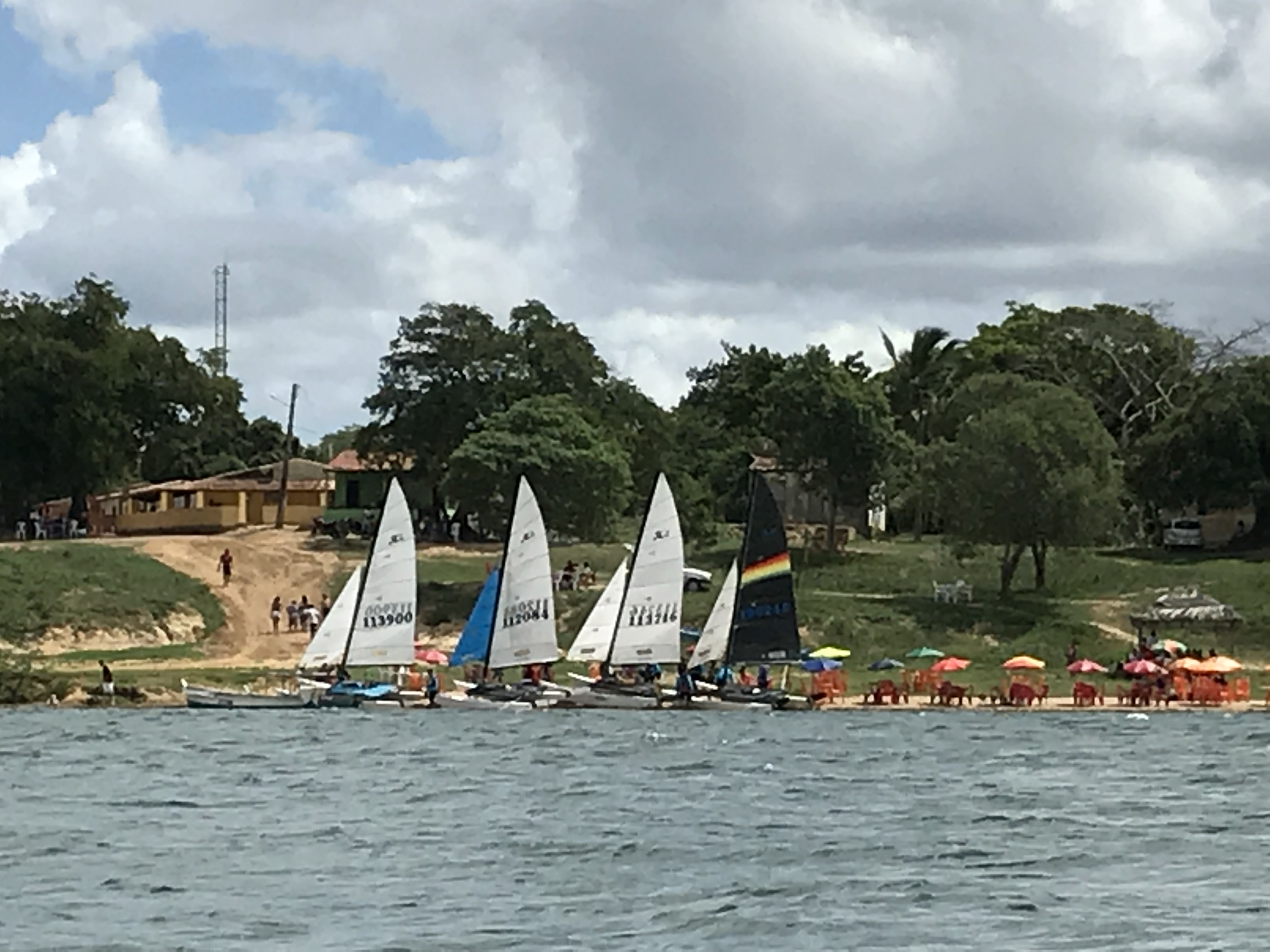 O caldo está engrossando. Nas duas primeiras versões do Rallye do Velho Chico participaram três barcos em cada uma delas. Este ano já somos sete barcos e aproximadamente vinte bikes, numa integração muito bacana entre as tribos do pedal e da vela. De todos os envolvidos creio que apenas o atual presidente e o vice-presidente da Associação Brasileira da Classe Hobie Cat foram presença carimbada em todas as três versões, além da dupla dinâmica do nosso barco de apoio, sem esquecer do folclórico amigo Huguinho. Chegamos ontem à tarde vindo de Recife/PE e nos instalamos da Pousada Prive Rio Belo. Localizada no povoado de Betume, em Neópolis/SE. Nos deliciamos com uma baita peixada (pense num pirão chama rede) após o que alguns foram montar seus barcos, outros simplesmente descansar e ainda teve o grupo da indiada mor que precisou viajar até o ponto de chegada do Rallye, em Niterói/SE, justamente para deixar seus veículos e reboques. Retornaram ali pelas duas da madruga (28), todos apertadinhos e amontoados. Depois de umas baforadas de BAIGON para detonar com a muriçocas que nos esperavam no quarto, liguei o ar condicionado e dormi o reparador sono dos justos. Acordamos cedinho no dia seguinte (28) e junto com uma chuvinha o vento deu o sinal da graça, mais cedo que esperado, o que nos possibilitou partir um tanto antes que o horário previsto. Nesse primeiro dia de TRIP velejamos por aproximadamente quatro horas entre o povoado de Betume e Propriá/SE. O pessoal da bike partiu um pouco antes, por volta das 7:00hs e também chegaram antes de nós no primeiro point. O vento esteve perfeito e as nuvens no céu inclusive serviram de alento pois evitaram que o sol castigasse nossa pele. Passamos por Neópolis/SE, Penedo/AL e quase ao final da tarde finalmente chegamos a Propriá/SE onde pernoitamos na simples, mas sempre acolhedora Pousada Chega Mais. Para mim tendo ar condicionado e ficando longe das malditas muriçocas não precisa de mais nada. Cada qual com suas frescuras! Devo admitir que além das muriçocas um certo ronco também incomoda, mas tá valendo a parceria do “primo” de longa data. Comi que nem um bicho (petiscos, depois um cheesburguer e para arrebatar um açaí), mas tudo isso porque não almoçamos, diga-se da passagem, e cai na cama como uma barata que dorme de bucho virado para cima.